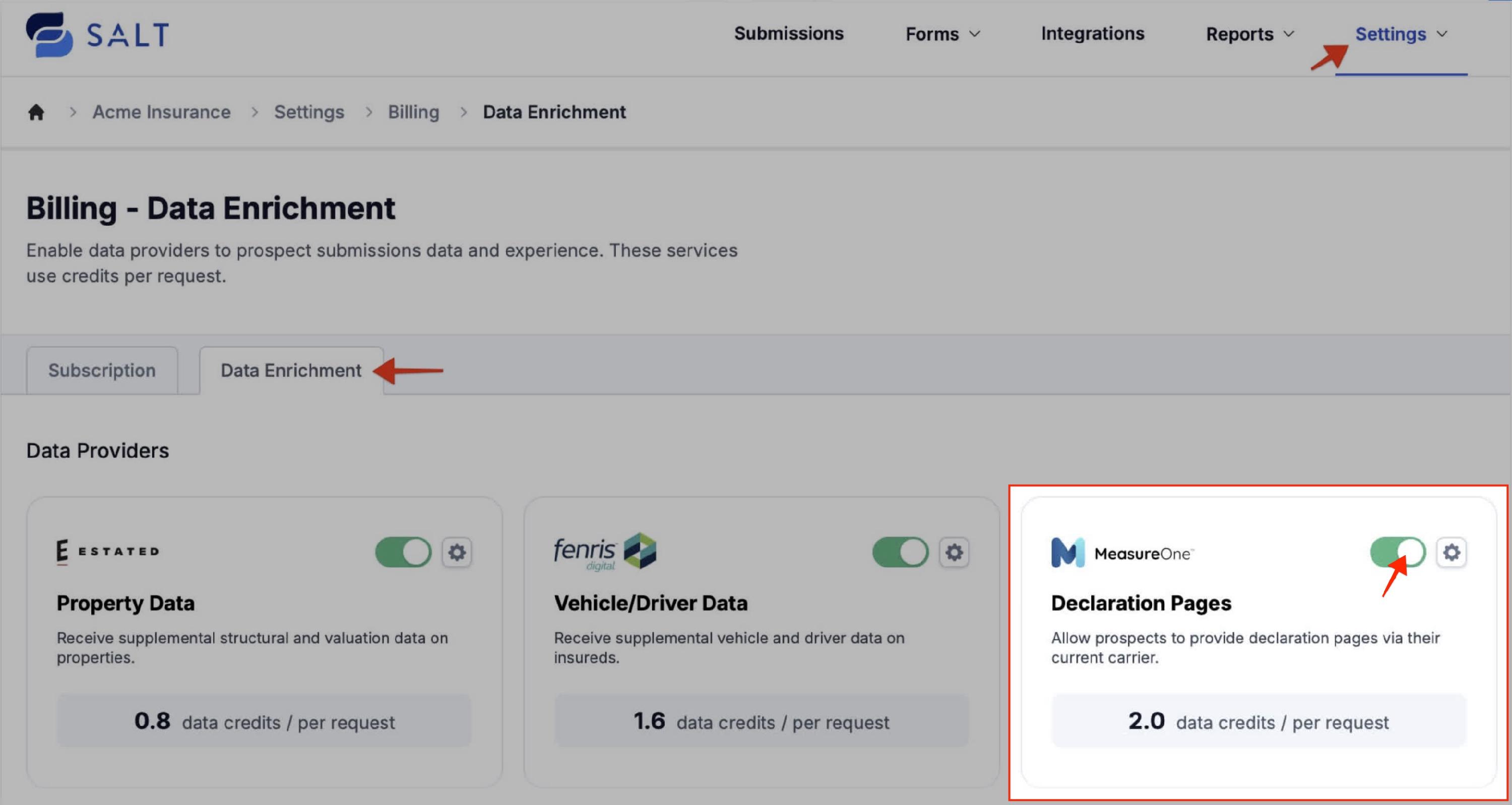 Agents can enable Measure One in their forms or send manual declaration page requests to prospects. Once a request is initiated, 2 data credits will be deducted from your current balance.