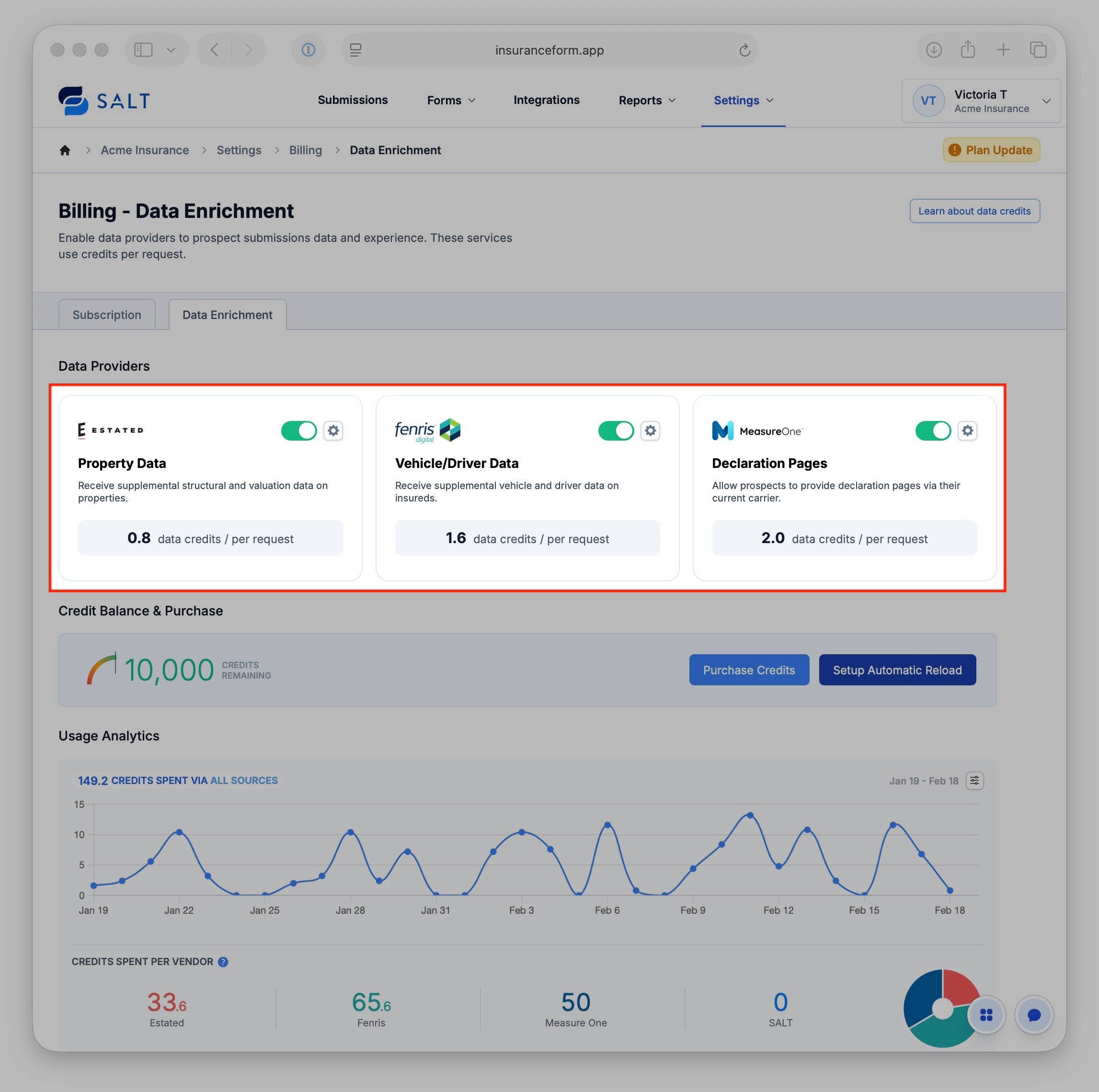 Purchasing a Data Credit package enables you to access our optional Data Provider integrations, allowing you to retrieve auto/home data reports and dec pages. Your credit balance will be allocated across these features.