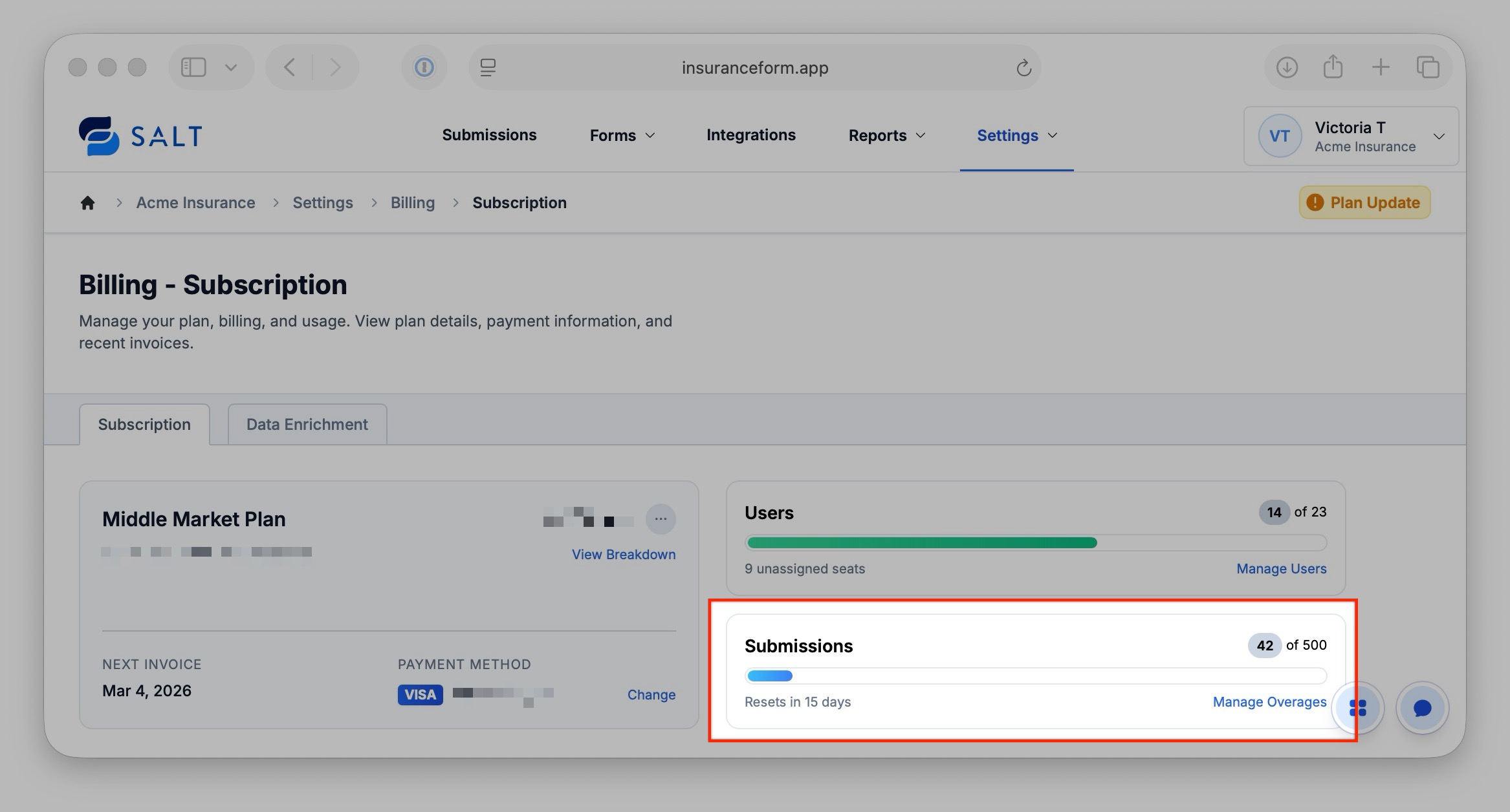 - A submission is processed past the submission allotment included with a SALT subscription. (i.e. You won't be charged a data credit for processing submissions until after your monthly allotment has been used.)