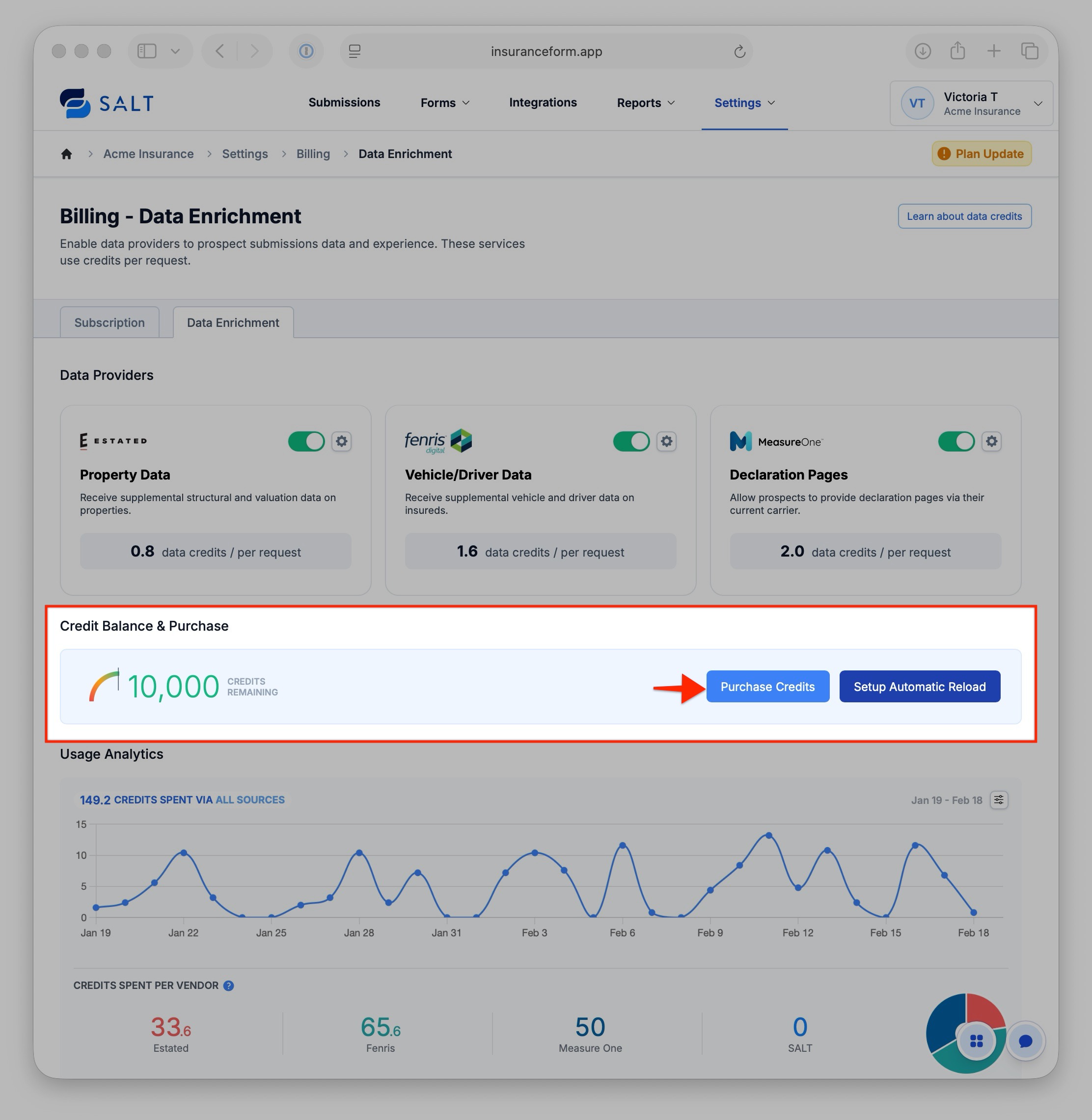 Admins/Owners can purchase Data Credits, view their agency’s Data Credit usage, and set up auto-reload by navigating to the Billing > Data Enrichment section.
