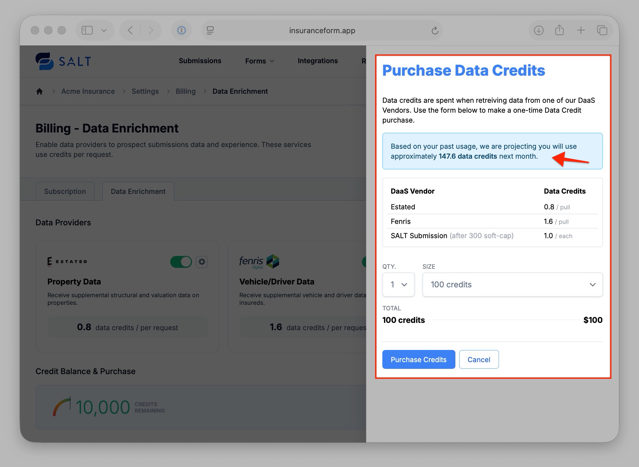 SALT Data Credits will need to be pre-purchased. Data Credits are priced at $1/ea with discounts available when purchased in bulk.