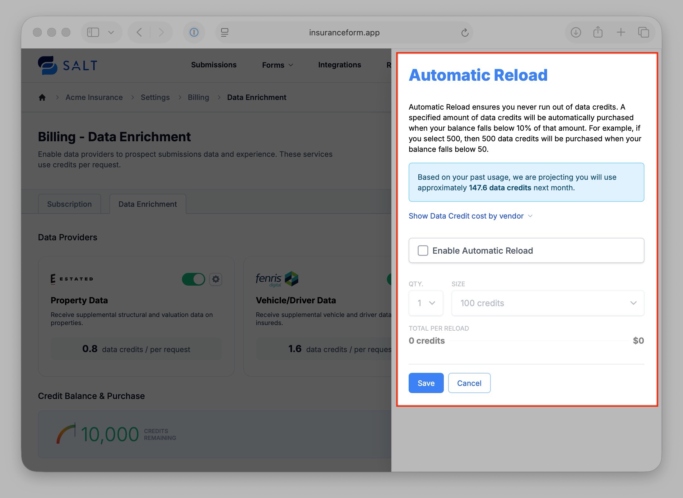 An agency can purchase data credits at its discretion. SALT will notify you when your data credit balance is low via email and banner notifications. We provide an auto-reload feature that agencies can opt-in to, helping prevent you from running out of credits.