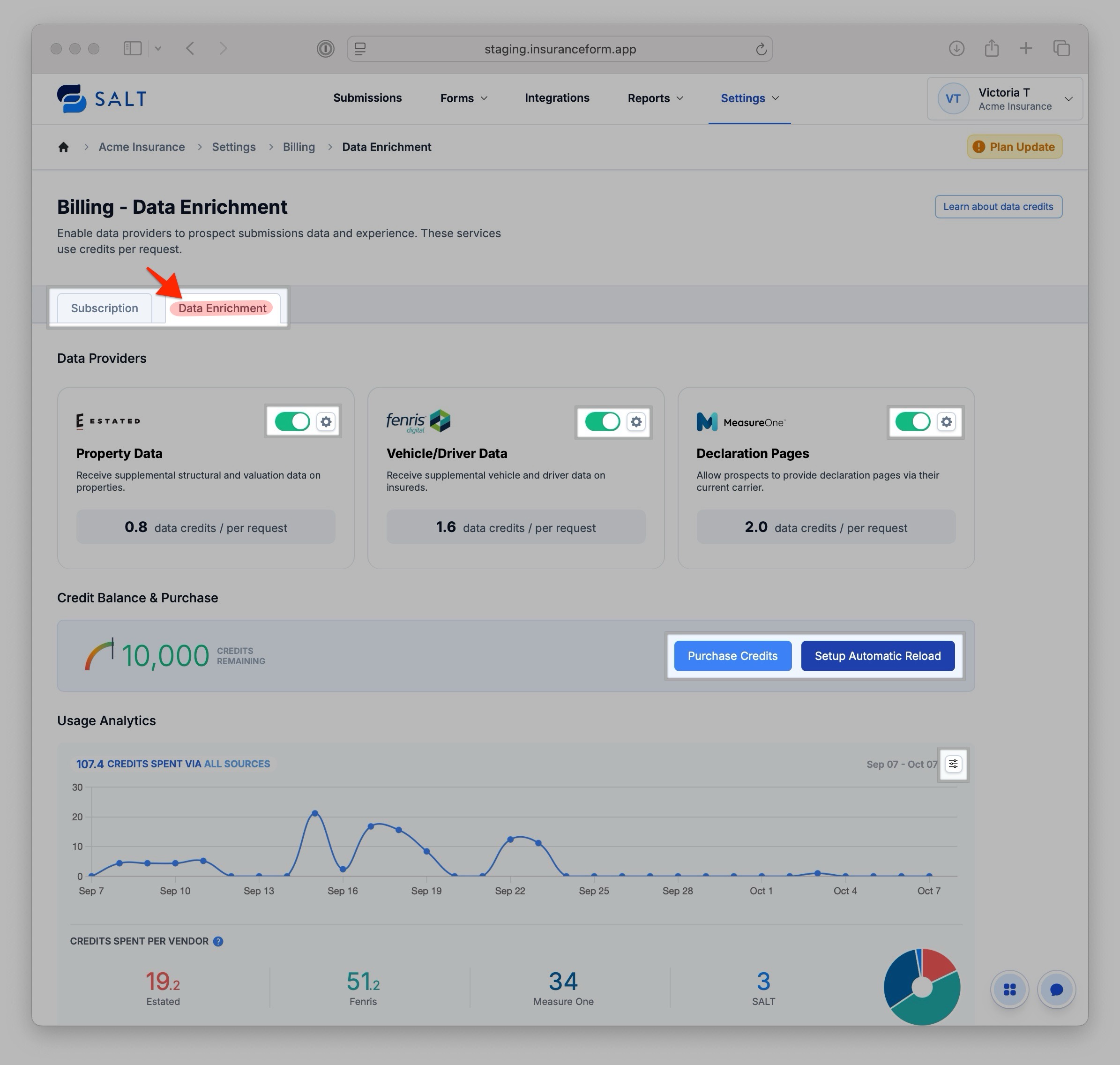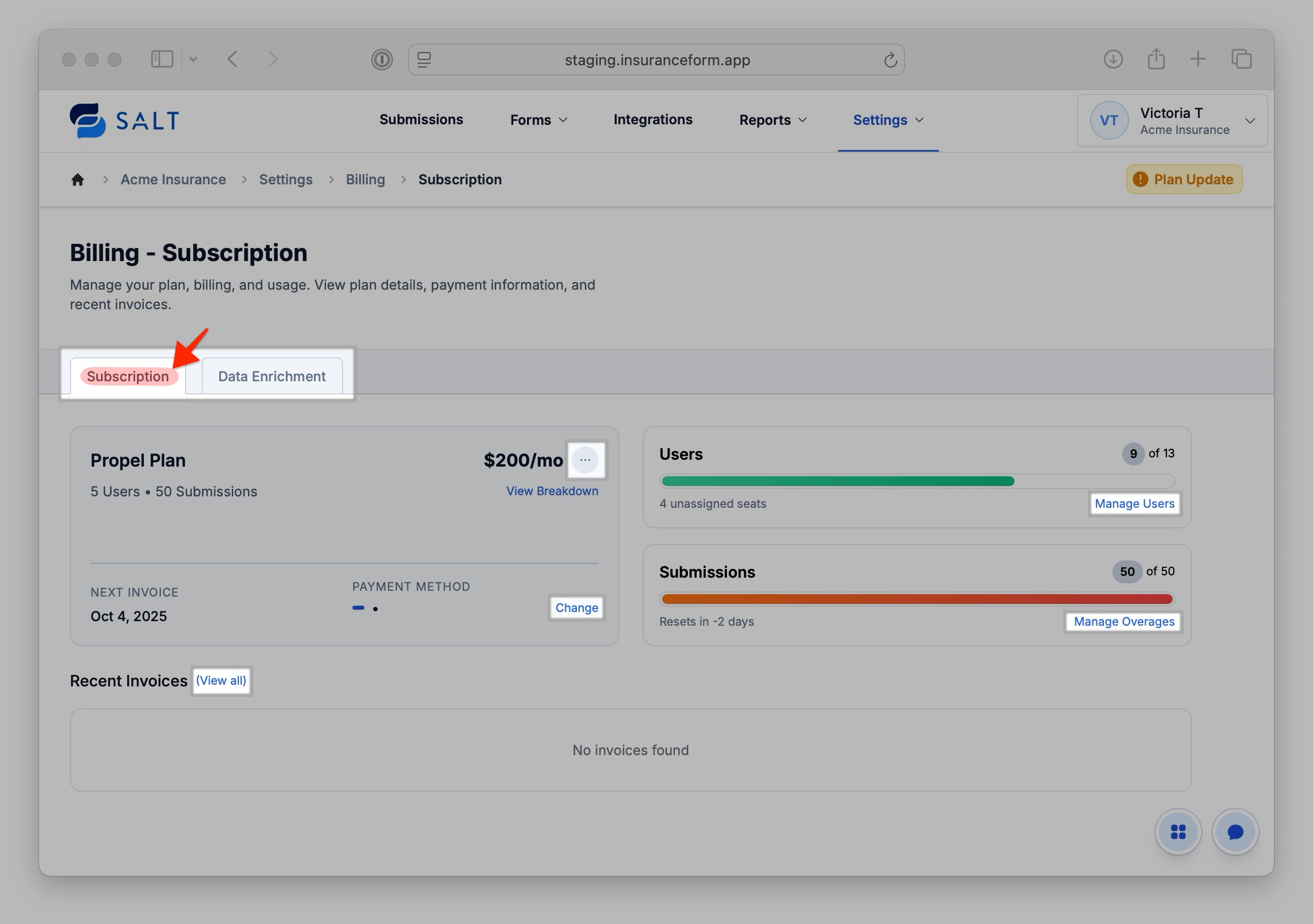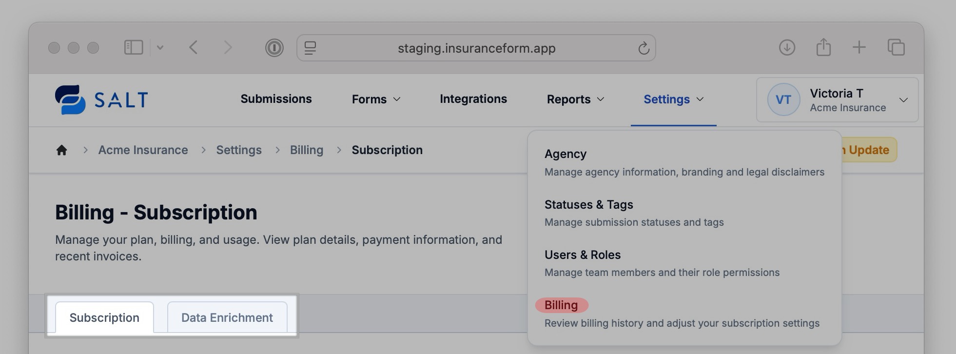 The Billing section now has two tabs: Subscription & Data Enrichment.