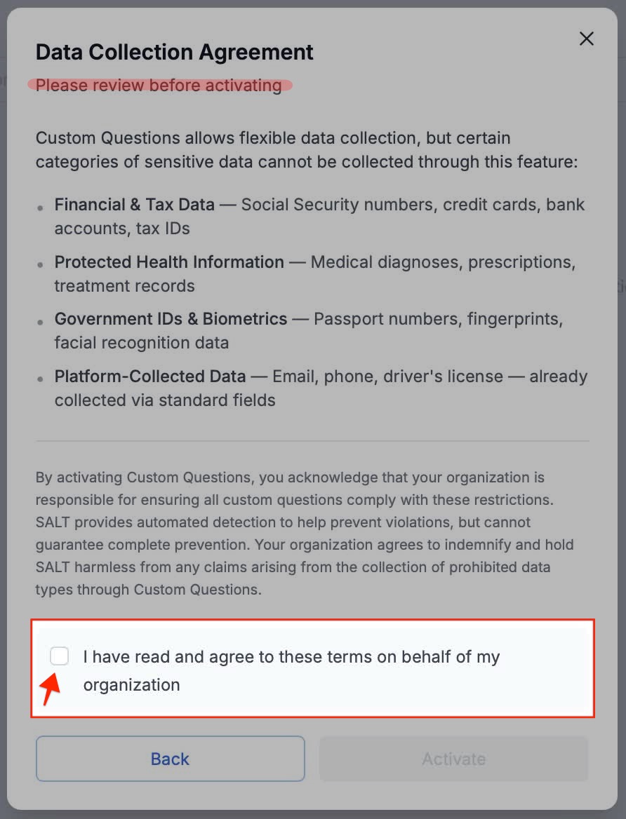 Activation applies to the entire organization. Once activated, users with the proper permissions (see below) can create and manage Custom Questions.