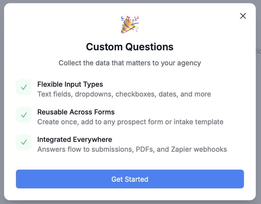 > Prospect Forms - Custom Questions can be added to prospect forms to collect additional information directly from clients during the intake process.