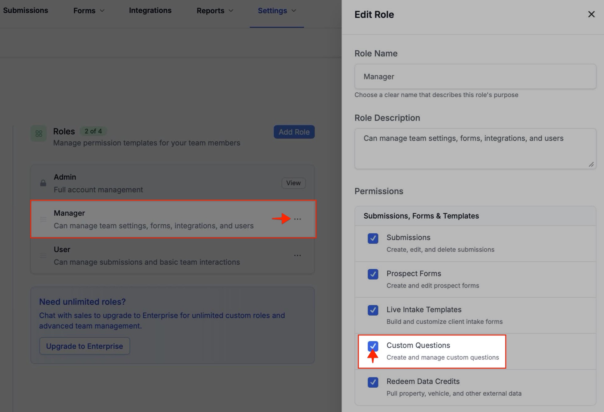 If your agency uses custom roles, you can enable the permission to manage Custom Questions per user.